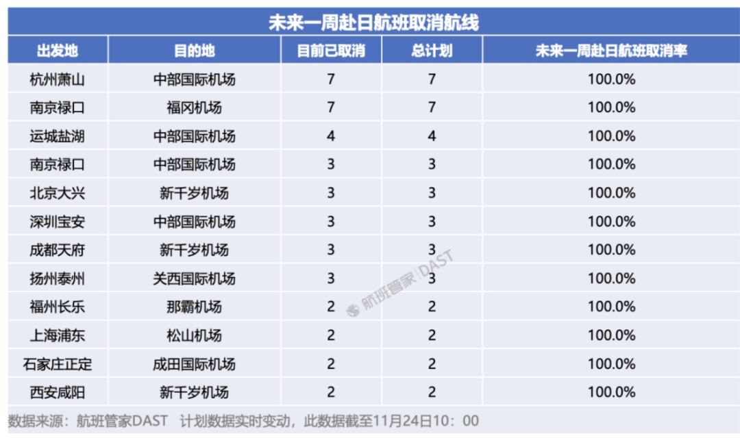 截至11月24日10點,中日航線已有12條航線取消所有航班。